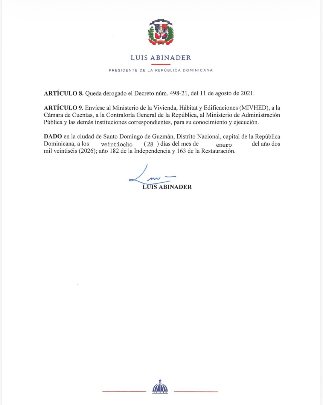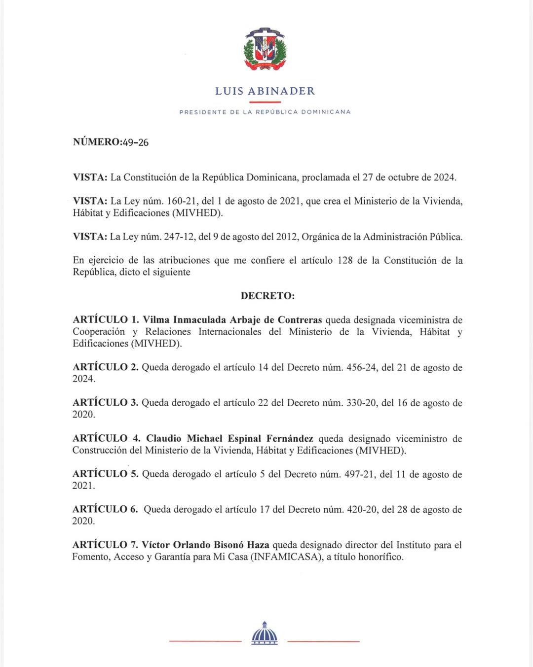 Santo Domingo, República Dominicana. — El presidente de la República, Luis Abinader, emitió el Decreto núm. 49-26 mediante el cual dispone nuevas designaciones y movimientos en el Ministerio de la Vivienda, Hábitat y Edificaciones (MIVHED), así como en el Instituto para el Fomento, Acceso y Garantía para Mi Casa (INFAMICASA).