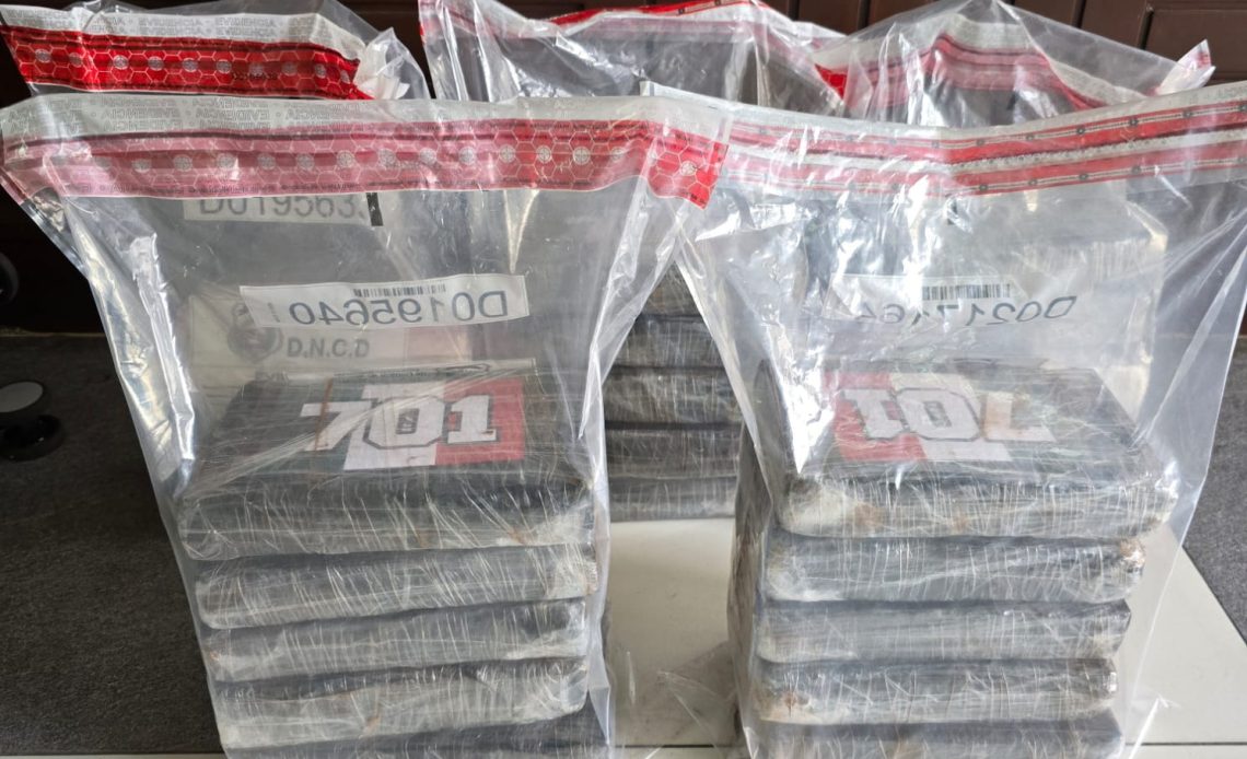 Agentes de la Dirección Nacional de Control de Drogas (DNCD) y miembros del Ministerio Público, apoyados por el Cuerpo Especializado de Seguridad Aeroportuaria (CESAC), incautaron 24 paquetes presumiblemente cocaína,durante labores de inspección e interdiccion conjunta, realizadas en el Aeropuerto Internacional de Las Américas, JFPG.
