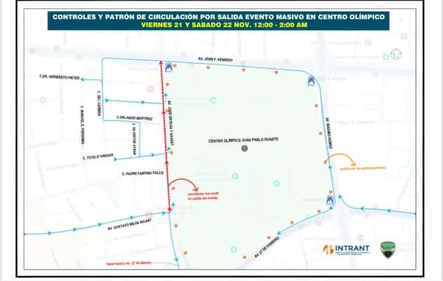 SANTO DOMINGO.– El Gabinete de Transporte, en coordinación con el Instituto Nacional de Tránsito y Transporte Terrestre (INTRANT) y la Dirección General de Seguridad de Tránsito y Transporte Terrestre (DIGESETT), informó la activación de un plan especial de movilidad debido al evento masivo del artista Bad Bunny que tendrá lugar el viernes 21 y sábado 22 de noviembre en el entorno del Centro Olímpico Juan Pablo Duarte.