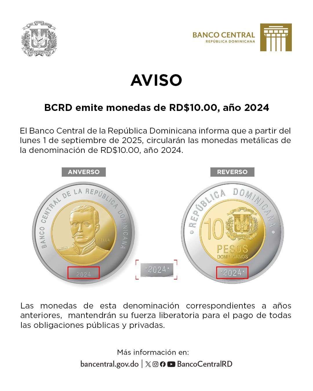 SANTO DOMINGO.— El Banco Central de la República Dominicana (BCRD) anunció este jueves la emisión de nuevas monedas de 10 pesos correspondientes al año 2024.