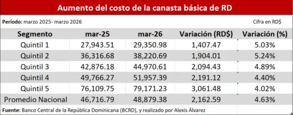 En marzo de este año, todos los quintiles de ingreso registraron aumentos, evidenciando una presión inflacionaria generalizada. En el segmento de menores ingresos (quintil 1), la canasta pasó de RD$27,943.51 a RD$29,350.98, un aumento de 5.03 % (RD$1,407.47). En el quintil 2, el alza fue de 5.24 %, al pasar de RD$36,316.18 a RD$38,220.69.