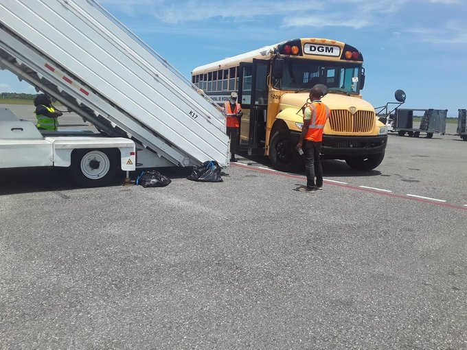 Un amplio dispositivo de seguridad, coordinado por agentes de la Dirección General de Migración (DGM), la Policía Nacional, el Cuerpo Especializado de Seguridad Aeroportuaria y de la Aviación Civil (CESAC) y otros organismos de inteligencia del Estado, esperaba a los deportados en la rampa noroeste del aeropuerto.
