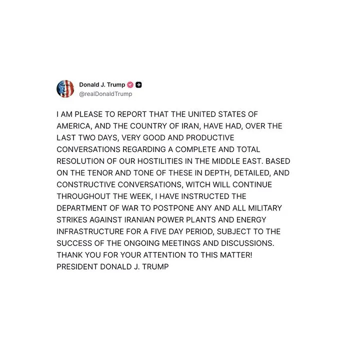 En ese contexto, Trump anunció que ha instruido al Departamento de Guerra de Estados Unidos a posponer por cinco días cualquier acción militar contra infraestructuras energéticas iraníes, incluyendo plantas eléctricas, como gesto vinculado al avance de las negociaciones.