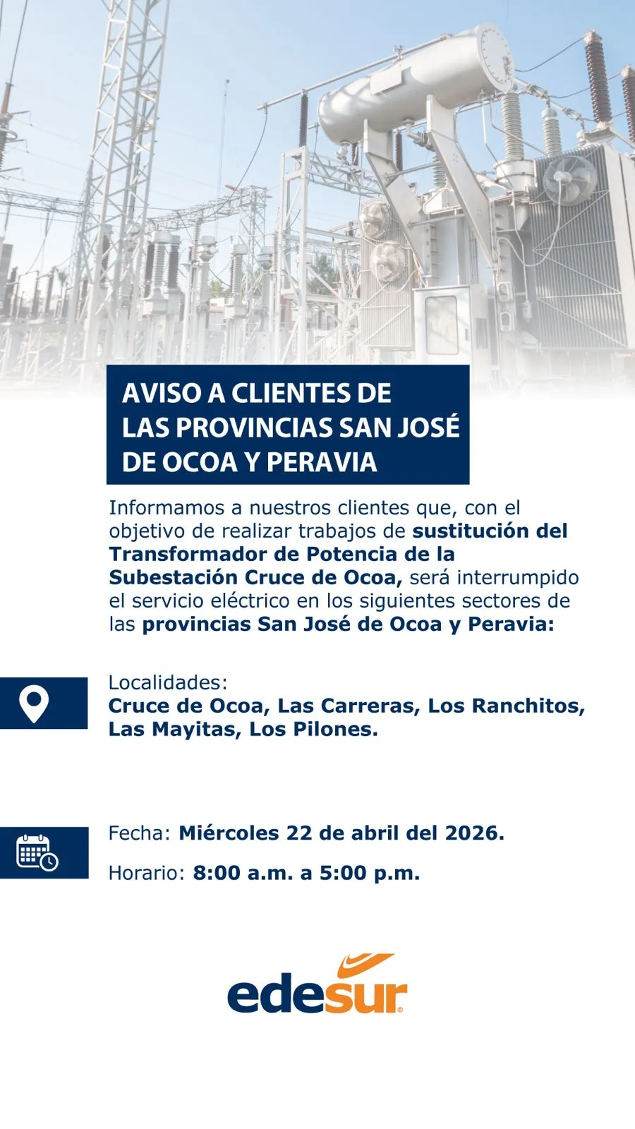 Edesur Dominicana informó este martes que, con el objetivo de continuar con su programa de mejoras en las redes eléctricas, realizará trabajos de sustitución del transformador de potencia de la subestación Cruce de Ocoa.