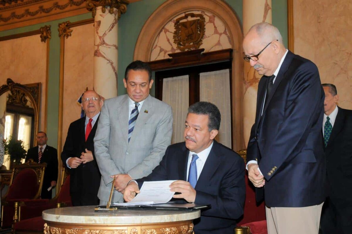 La fotografía capta el momento en que el entonces presidente Leonel Fernández promulga la Ley 108-10 para el fomento de la industria del cine en la República Dominicana. Le acompañan el exministro de Cultura, José Rafael Lantigua; el doctor Abel Rodríguez del Orbe, exconsultor jurídico del Poder Ejecutivo, y, al fondo, el excanciller y exvicepresidente Carlos Morales Troncoso.