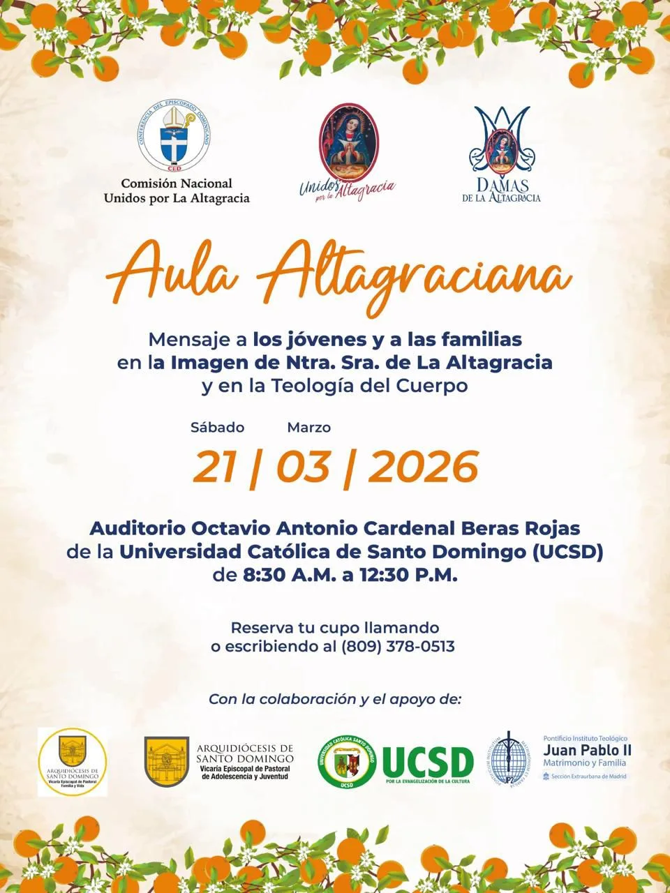 Ante la creciente desorientación que experimentan tanto los jóvenes como las familias, la Comisión Nacional Unidos por la Altagracia, de la Conferencia del Episcopado Dominicano (CED), junto a la Asociación de Damas de la Altagracia, anuncian la tercera edición de su Aula Altagraciana bajo el título: “Mensaje a los jóvenes y las familias en la imagen de Nuestra Señora de la Altagracia y en la Teología del Cuerpo”.