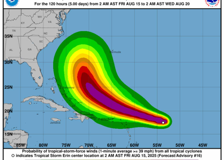 Indomet confirmó que está monitoreando de manera constante la evolución y trayectoria de la tormenta tropical Erin. El sistema se localiza a 920 kilómetros al este de las Antillas Menores, con vientos máximos sostenidos de 110 km/h y ráfagas superiores.