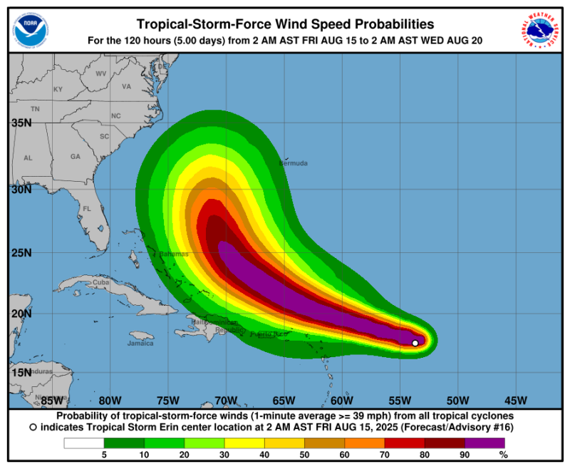 Se pronostica un fortalecimiento gradual, por lo que Erin podría convertirse en huracán en los próximos días. La institución también observa otra amplia área de aguaceros y tormentas sobre el oeste del Golfo de México, con un 50 % de probabilidad de desarrollo ciclónico en los próximos siete días.