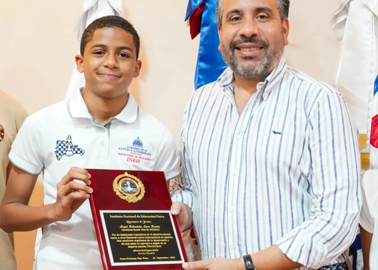 SANTO DOMINGO.— El director ejecutivo del Instituto Nacional de Educación Física (INEFI), Alberto Rodríguez Mella, reconoció al joven y destacado ajedrecista, Ángel Sebastián Lara Santos, por su desempeño en el Campeonato Panamericano de Ajedrez Escolar celebrado en Brasil. Lara Santos se coronó bicampeón del certamen, donde compitió con atletas de Argentina, Chile, Perú, Paraguay y Estados Unidos.