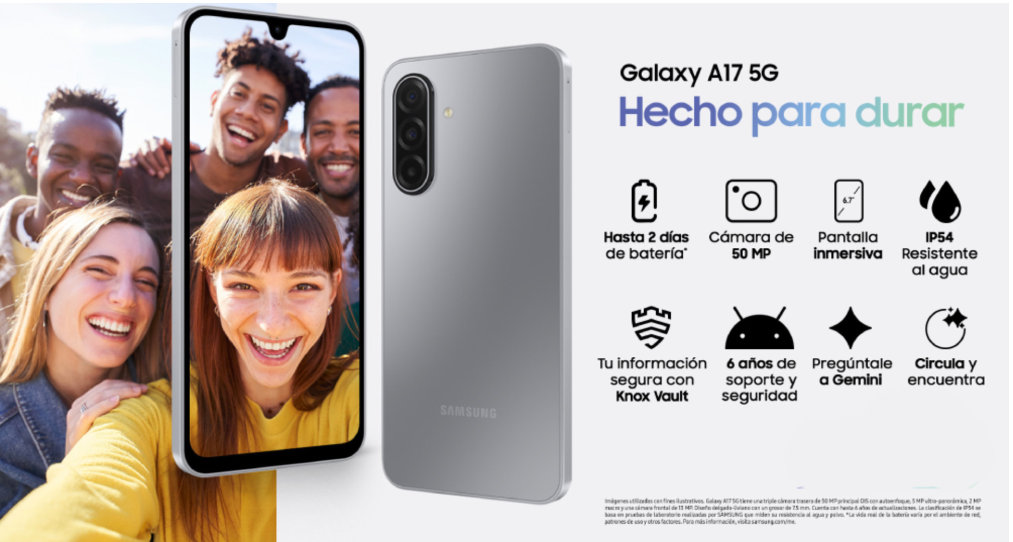 Además de la innovadora función de IA, el Galaxy A17 se consolida como un equipo de alto rendimiento. Ofrece una cámara principal de 50 MP con OIS, una pantalla fluida con tasa de refresco de hasta 90 Hz, y una batería de larga duración.