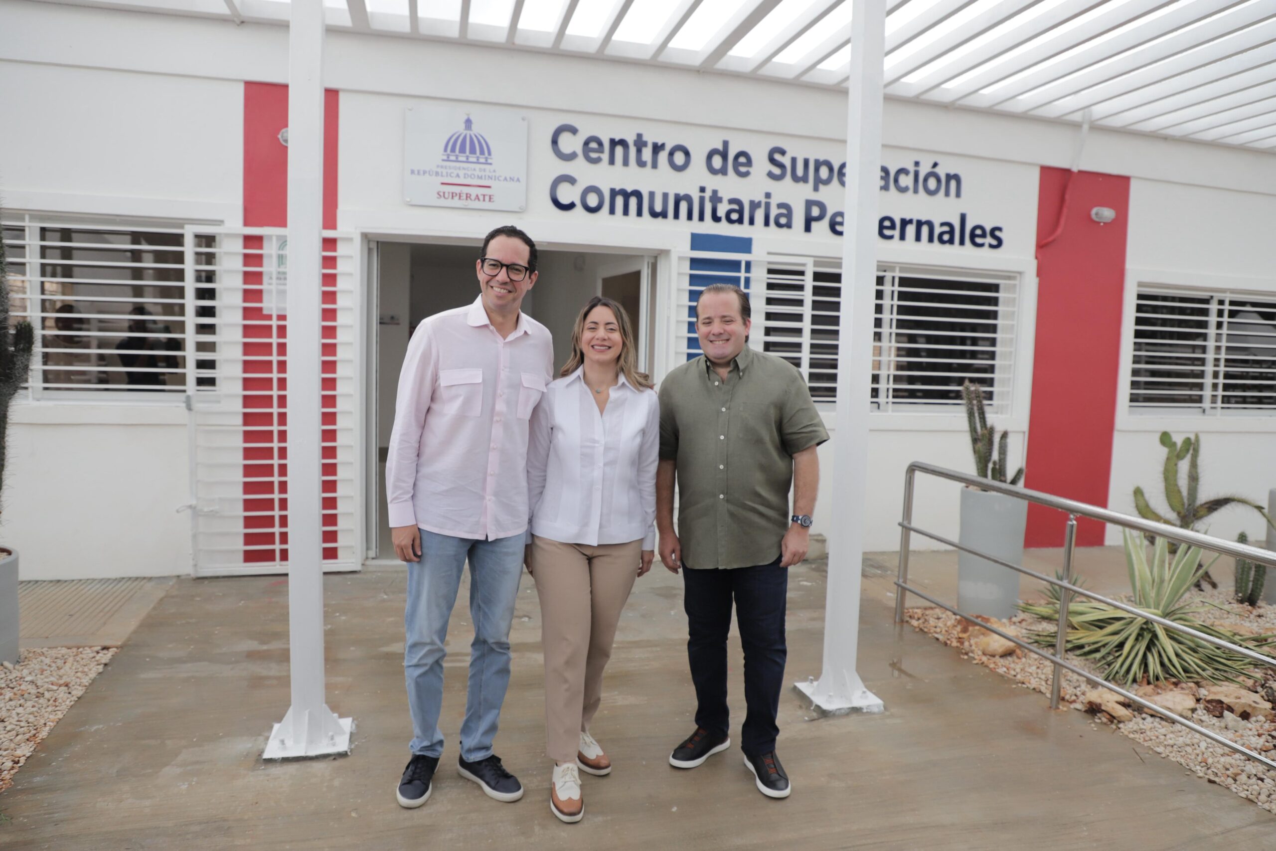 Gloria Reyes, Directora DSSS, junto a José Ignacio Paliza, ministro de la Presidencia, y Sigmund Freud, ministro del Ministerio de Administración Pública, en las instalaciones del nuevo Centro Comunitario Supérate.