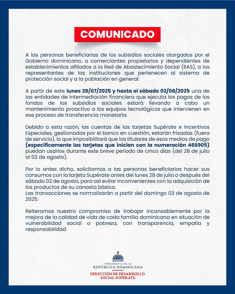 “A partir de este lunes 28/07/2025 y hasta el sábado 02/08/2025 una de las entidades de intermediación financiera que ejecuta los pagos de los fondos de los subsidios sociales estará llevando a cabo un mantenimiento proactivo a los equipos tecnológicos que intervienen en ese proceso de transferencia monetaria”, señala el comunicado.
