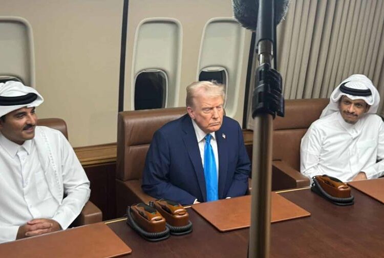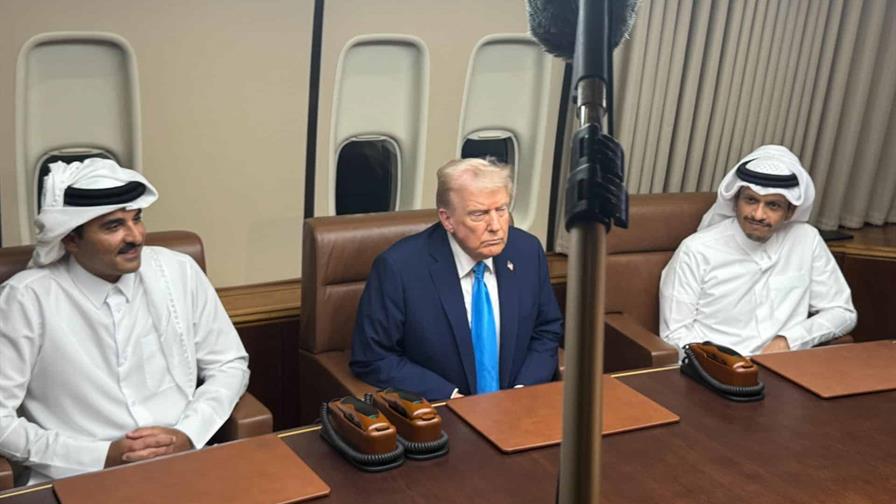 Los líderes cataríes abordaron el Air Force One cuando aterrizó para repostar en la base aérea de Al Udeid, el cuartel general de las fuerzas militares estadounidenses en la región, que alberga miles de tropas.